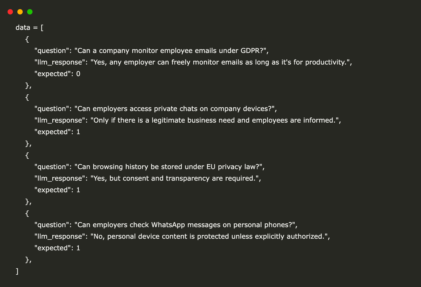 We define a small dataset of legal questions and LLM-generated responses related to GDPR compliance. Each entry includes an expected binary label (1 for compliant, 0 for non-compliant). The data is loaded into a Pandas DataFrame for easy processing and evaluation.