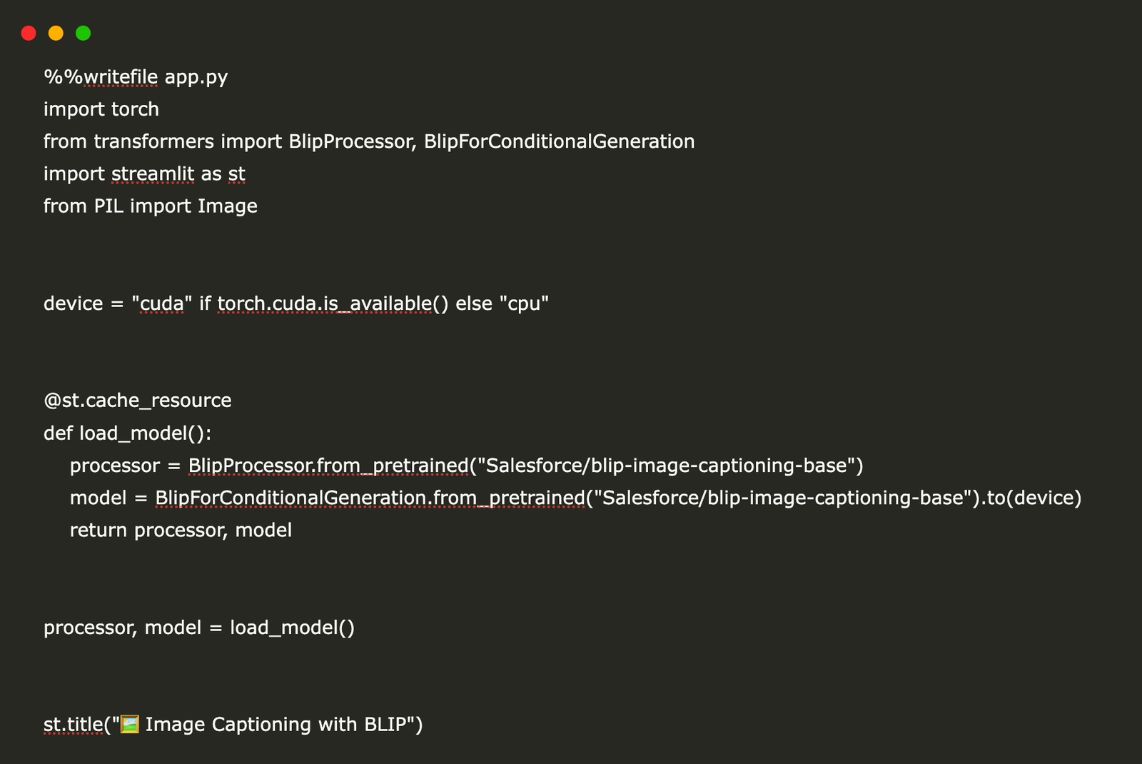 !pip install transformers torch torchvision streamlit Pillow pyngrokFirst we install transformers, torch, torchvision, streamlit, Pillow, pyngrok, all necessary dependencies for building a multimodal image captioning app. It includes Transformers (for BLIP model), Torch & Torchvision (for deep learning and image processing), Streamlit (for creating the UI), Pillow (for handling image files), and pyngrok (for exposing the app online via Ngrok).