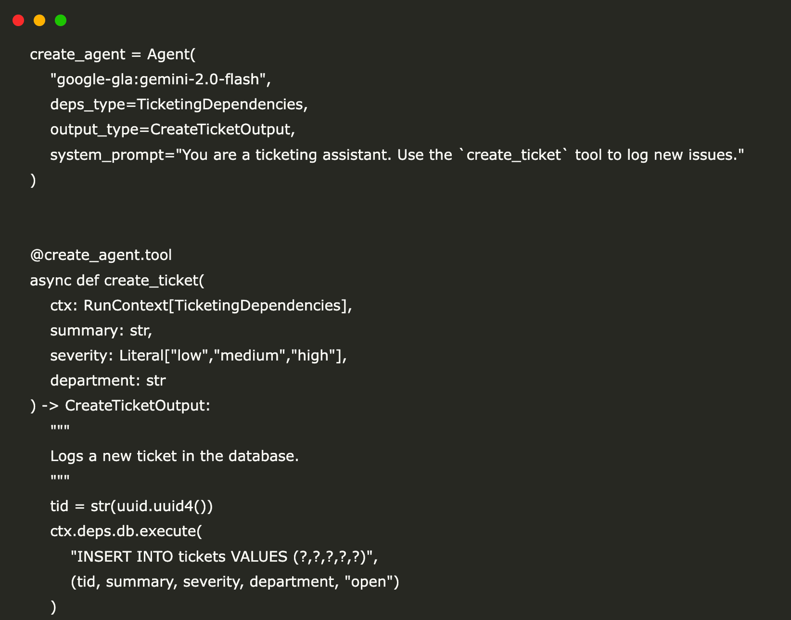 We create a PydanticAI Agent named’ create_agent’ that’s wired to Google Gemini and is aware of our SQLite connection (deps_type=TicketingDependencies) and output schema (CreateTicketOutput). The @create_agent.tool decorator then registers an async create_ticket function, which generates a UUID, inserts a new row into the tickets table, and returns a validated CreateTicketOutput object.
