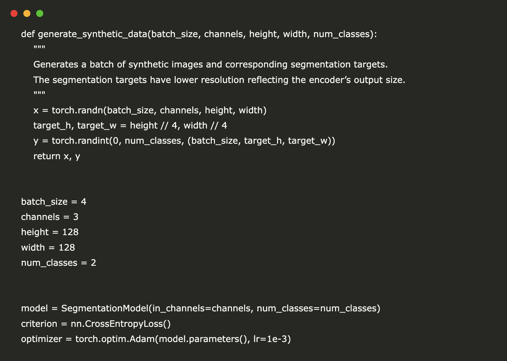 print("Output shape:", output.shape)We instantiate the segmentation model and pass a dummy batch of two 128×128 RGB images through it. The printed output shape confirms that the model processes the input correctly and produces segmentation maps with the expected dimensions.