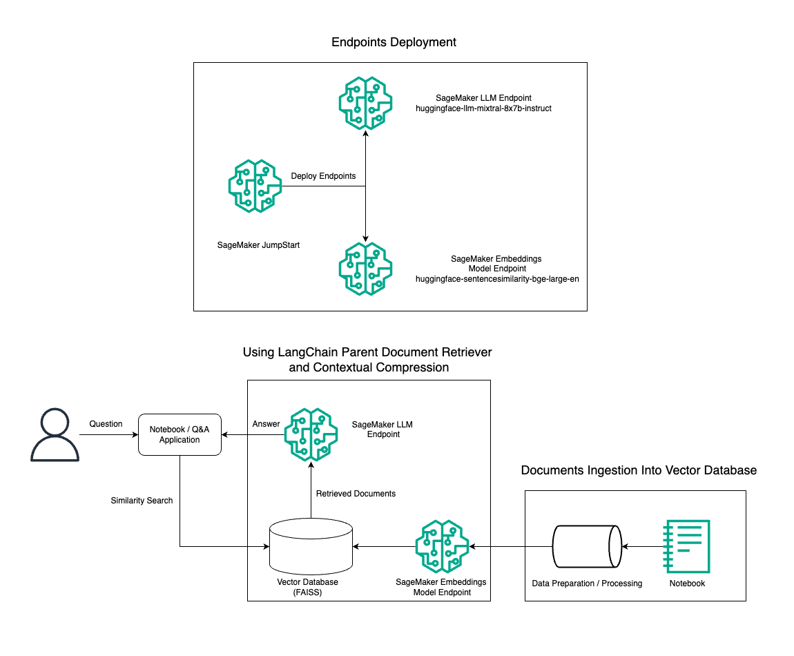 In this post, we demonstrate the use of Mixtral-8x7B Instruct text generation combined with the BGE Large En embedding model to efficiently construct a RAG QnA system on an Amazon SageMaker notebook using the parent document retriever tool and contextual compression technique. The following diagram illustrates the architecture of this solution.