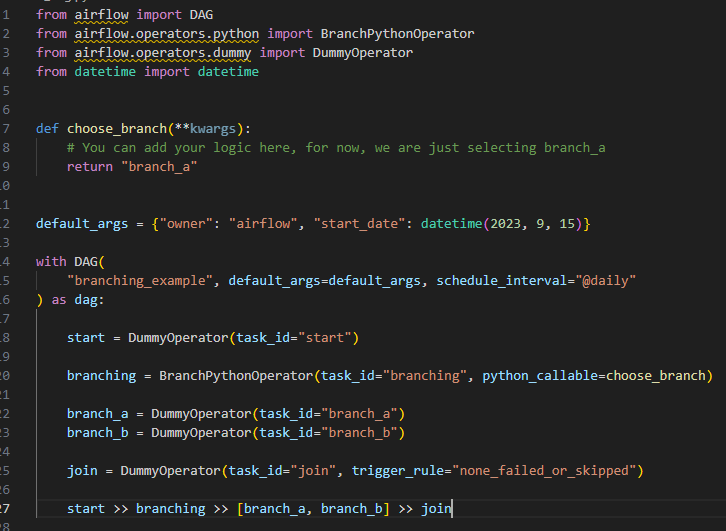 • The BranchPythonOperator decides whether to follow branch_a or branch_b.