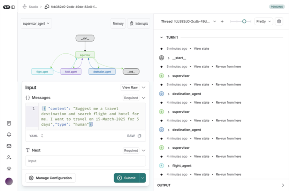 You’re now ready to test the multi-agent travel assistant. You can start the graph using the langgraph dev command. It will start the LangGraph API server in development mode with hot reloading and debugging capabilities. As shown in the following screenshot, the interface provides a straightforward way to select which graph you want to test through the dropdown menu at the top left. The Manage Configuration button at the bottom lets you set up specific testing parameters before you begin. This development environment provides everything you need to thoroughly test and debug your multi-agent system with real-time feedback and monitoring capabilities.