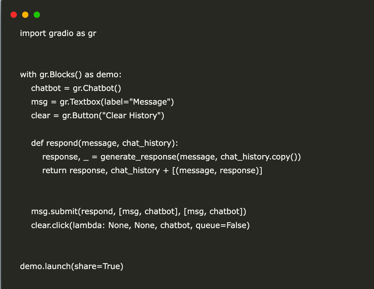 demo.launch(share=True)Finally, we build a web-based chatbot interface using Gradio. It creates UI elements for chat history, message input, and a clear history button, and defines a response function that integrates with the text-generation pipeline to update the conversation. Finally, the demo is launched with sharing enabled for public access.