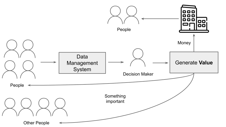 If we accept the definition of value as the amount of money, a decision maker could generate value for the company they work for and indirectly for the people in the company and the people using the services or products offered by the company. If we accept the definition of value as the importance of something, the value is essential for the people generating data and other external people, as shown in the following figure.