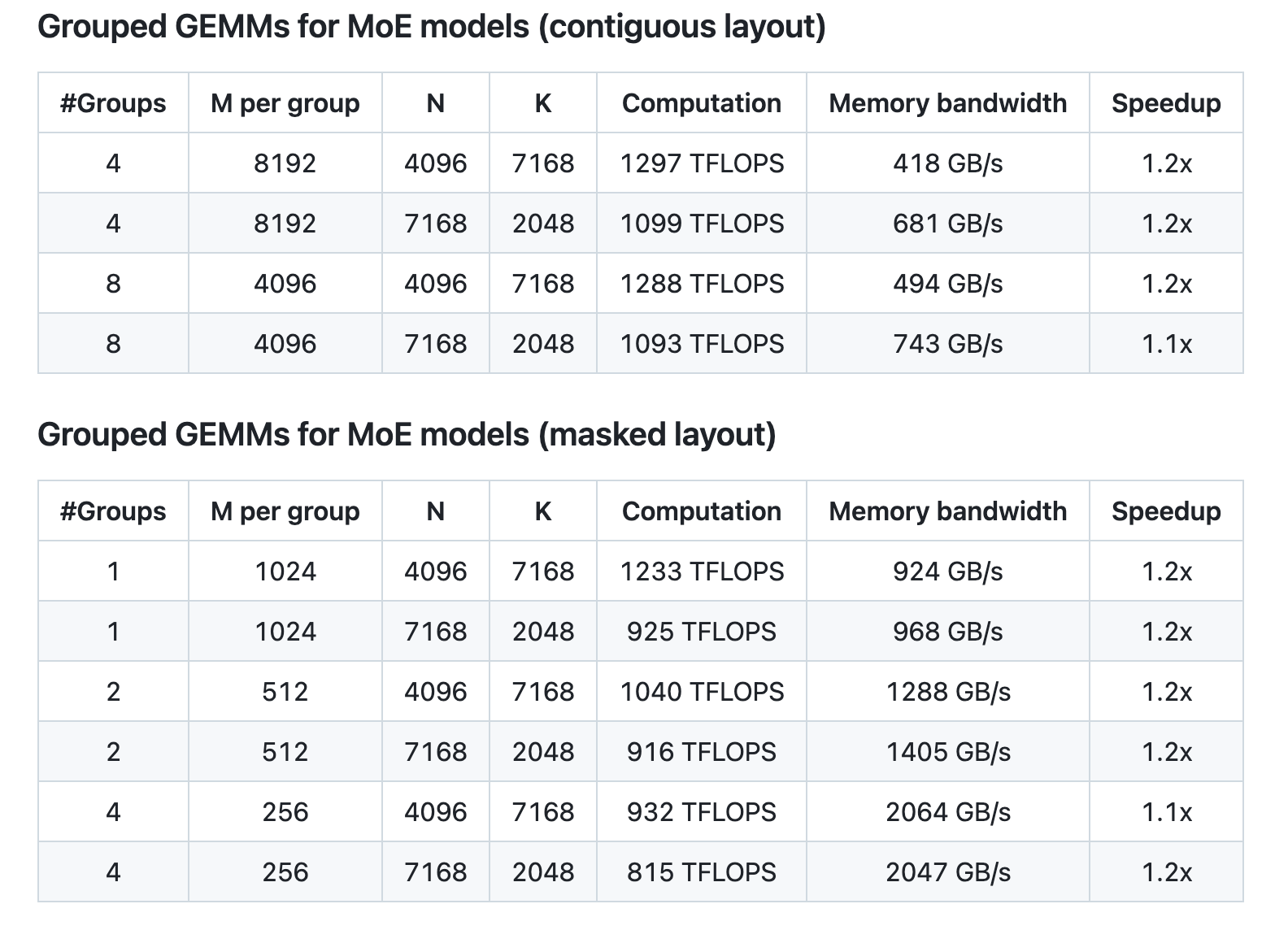 DeepGEMM draws inspiration from established libraries like CUTLASS and CuTe, yet it deliberately avoids a heavy dependency on complex templates or algebraic frameworks. Instead, the focus remains on providing a clean and accessible codebase that concentrates on optimizing GEMM operations for both normal and grouped configurations. The support for grouped GEMMs, designed for MoE models, is implemented in two forms: contiguous and masked layouts. Each is carefully structured to accommodate varying token counts per expert, reflecting the practical demands of modern inference and training tasks.
