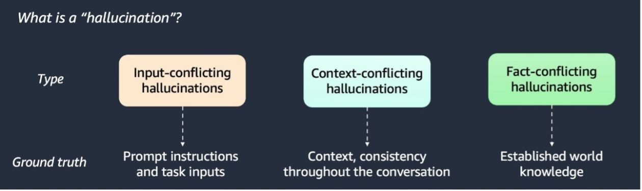 Hallucinations can be categorized into three types, as illustrated in the following graphic.