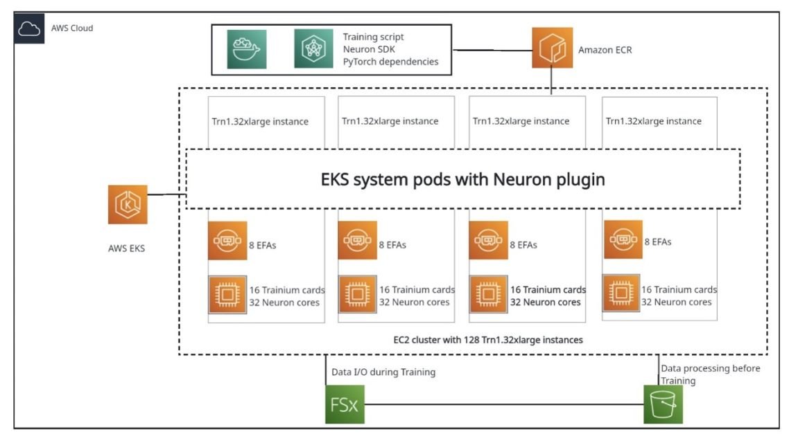 • Orchestration – We first trained the Llama 2-7B from scratch using a trn1.32xlarge cluster that is managed through Amazon Elastic Kubernetes Service (Amazon EKS). For details about the setup procedure, refer to Train Llama2 with AWS Trainium on Amazon EKS. We followed the same procedure but set up the cluster at a much larger scale with 128 trn1.32xlarge instances.