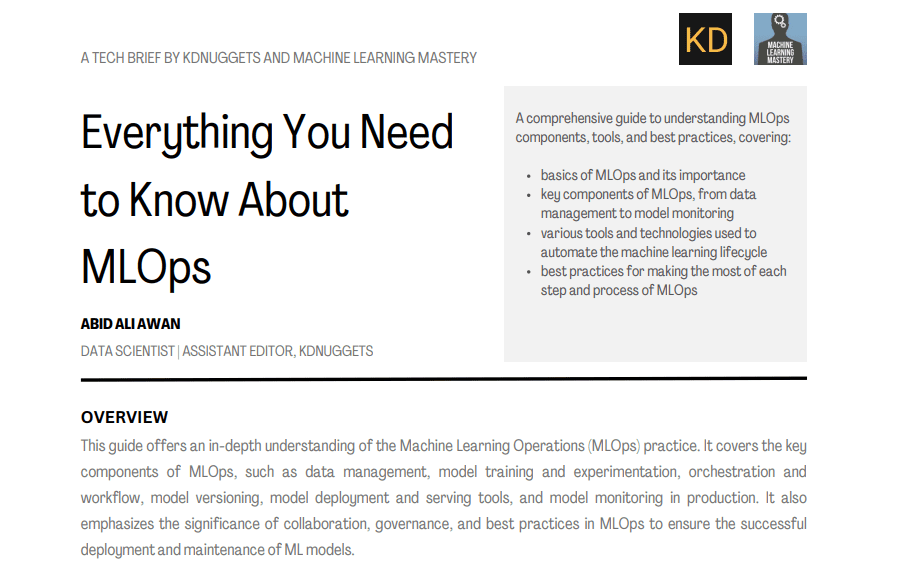 Everything You Need to Know About MLOps offers a comprehensive overview of the field, covering everything from the basics and key components, such as data management, model monitoring, and the use of various tools and technologies, to best practices aimed at maximizing the effectiveness of machine learning projects. It’s tailored to equip you with a thorough understanding of how MLOps functions as the backbone of successful machine learning projects, addressing the challenges of deploying and maintaining ML models in production environments.