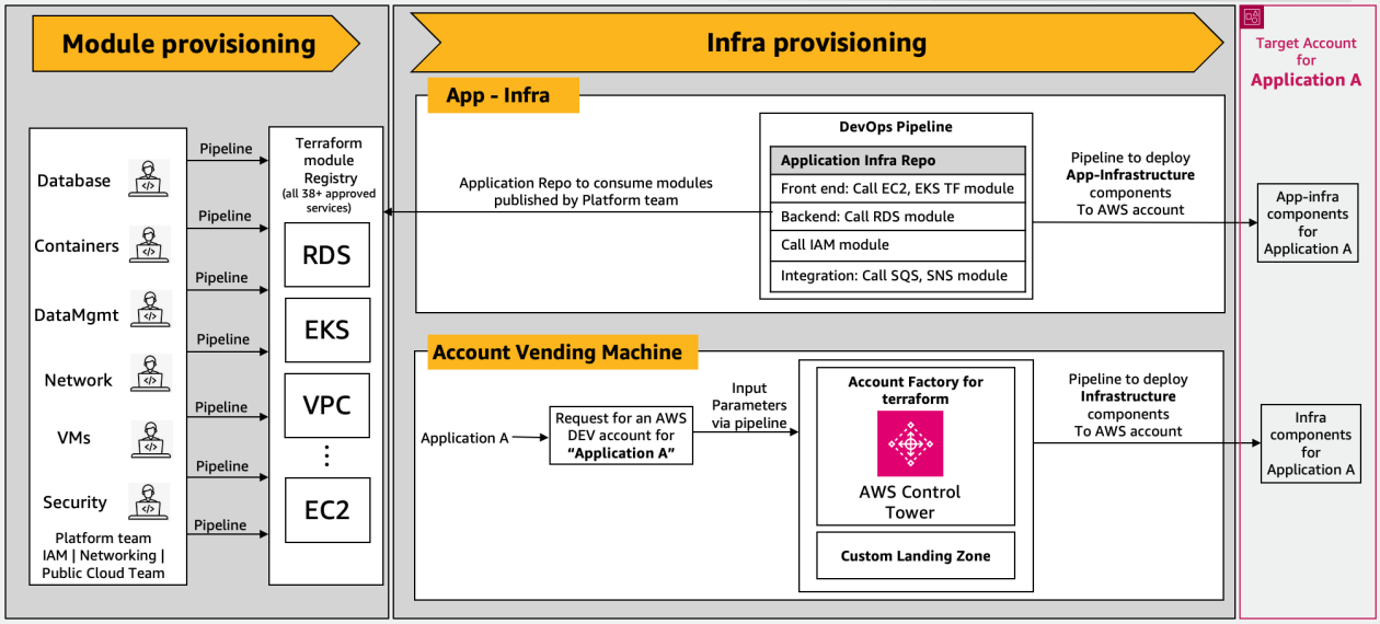 - Module provisioning – Different platform teams across various domains, such as databases, containers, data management, networking, and security, develop and publish certified or custom modules. These are delivered through pipelines to a Terraform private module registry, which is maintained by the organization for consistency and standardization.