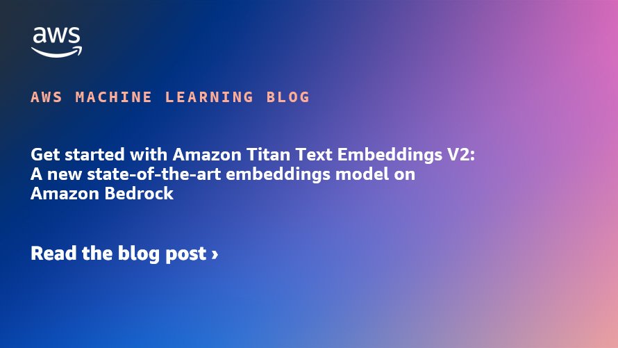 In this post, we introduced the new Amazon Titan Text Embeddings V2 model, with superior performance across various use cases like retrieval, reranking, and multilingual tasks. You can potentially realize substantial cost savings and performance improvements by reindexing your vector embeddings using the V2 model. The specific benefits will vary based on factors such as the volume of data, search traffic, and storage requirements, but the examples discussed in this post illustrate the potential value proposition. Amazon Titan Text Embeddings V2 is available today in the us-east-1 and us-west-2 AWS Regions.