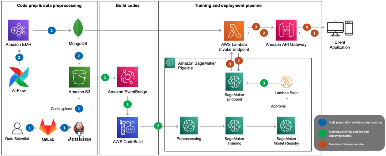 - The EMR preprocessing batch runs through Airflow according to the specified schedule. The preprocessing data is loaded into MongoDB, which is used as a feature store along with Amazon S3.