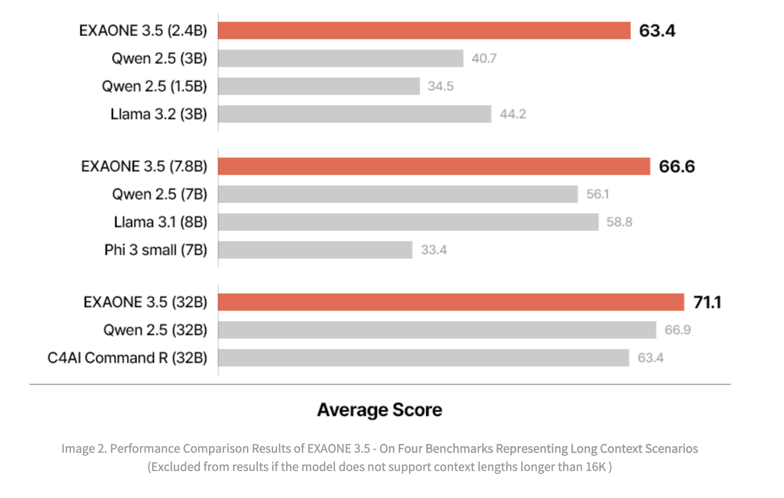 - Superior Instruction Following Capabilities: EXAONE 3.5 excels in usability-focused tasks, delivering the highest average scores across seven benchmarks representing real-world use cases. This demonstrates its ability to enhance productivity and efficiency in industrial applications. All three models performed significantly better than global models of similar sizes in English and Korean.