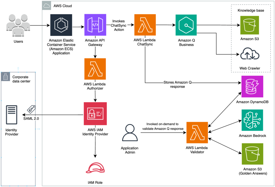 - The architecture includes a Validator Lambda function, which is used by the admin to validate the accuracy of the responses generated by the Amazon Q Business application.