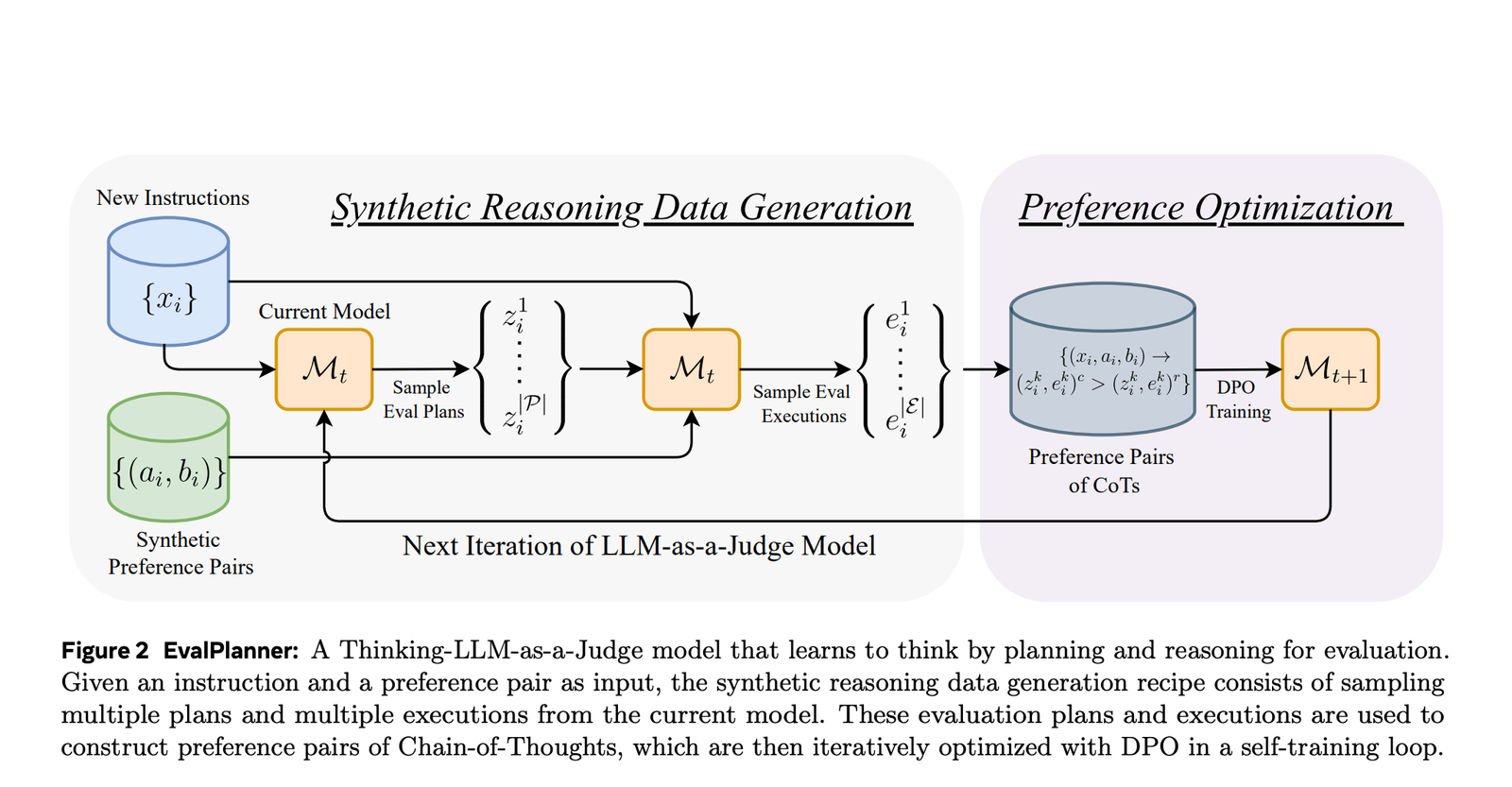 EvalPlanner is a preference optimization algorithm specifically designed for Thinking-LLM-as-a-Judge models. EvalPlanner differentiates itself by employing a three-stage evaluation process: (1) generation of an unconstrained evaluation plan, (2) execution of the plan, and (3) final judgment. Unlike previous methods, EvalPlanner does not constrain reasoning traces to predefined rubrics or criteria. Instead, it generates flexible evaluation plans that adapt to various domains and task requirements. The system operates in a self-training loop, iteratively refining evaluation plans and execution strategies using synthetically generated preference pairs. By continuously optimizing itself, EvalPlanner ensures more reliable, transparent, and scalable evaluations compared to existing LLM-as-a-Judge models.