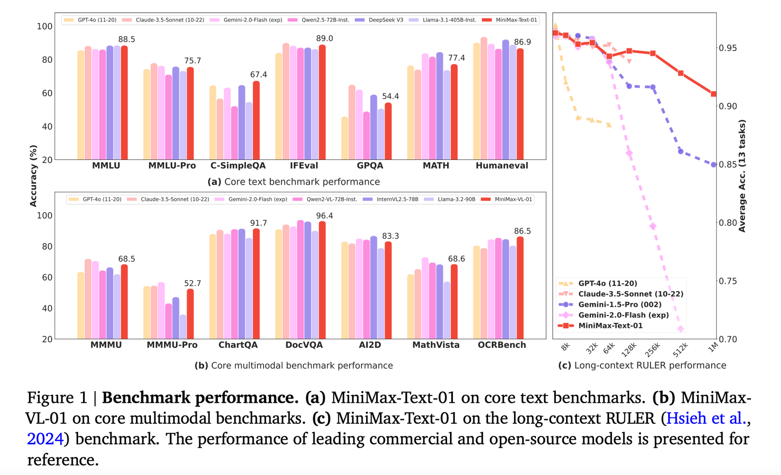 - The vision-language model MiniMax-VL-01 surpasses many peers, with a 96.4% accuracy rate on DocVQA and 91.7% on AI2D benchmarks.