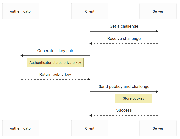 Upon receiving the public key and challenge, the server validates the challenge and the session from which it was created. If that checks out, the public key is stored, as well as any other relevant information like the user identifier or attestation data, in the database.
