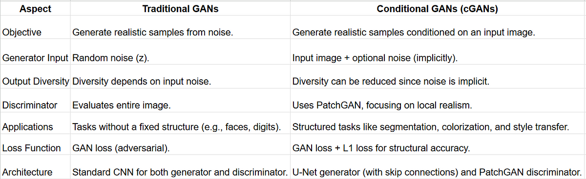 - In tasks like translating semantic maps to images or edges to objects, cGANs leverage the input image as a structural guide, producing outputs aligned with the input structure.
