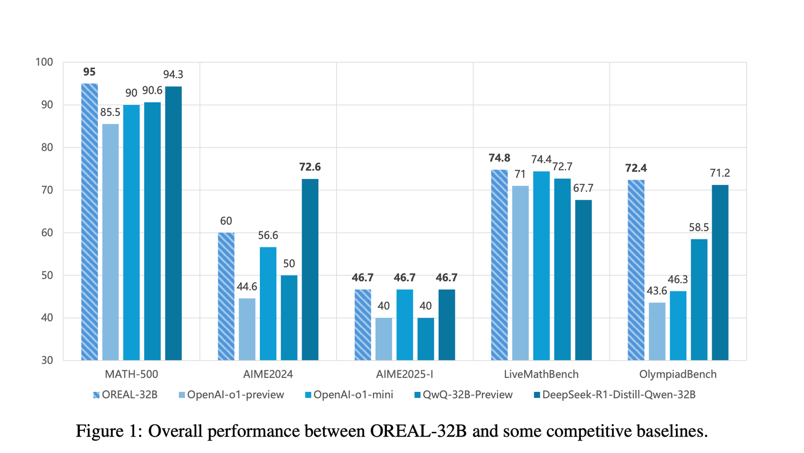 - OREAL-32B surpasses DeepSeek-R1-Distill-Qwen-32B and OpenAI-o1-preview, demonstrating effective training strategies.