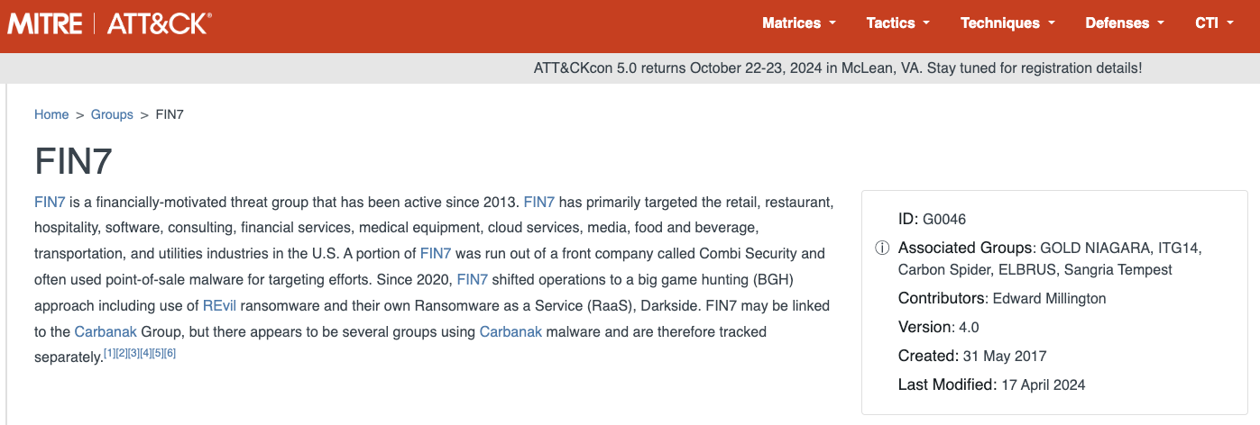 A 2022 deep dive on Fin7 from the Swiss threat intelligence firm Prodaft (PDF).