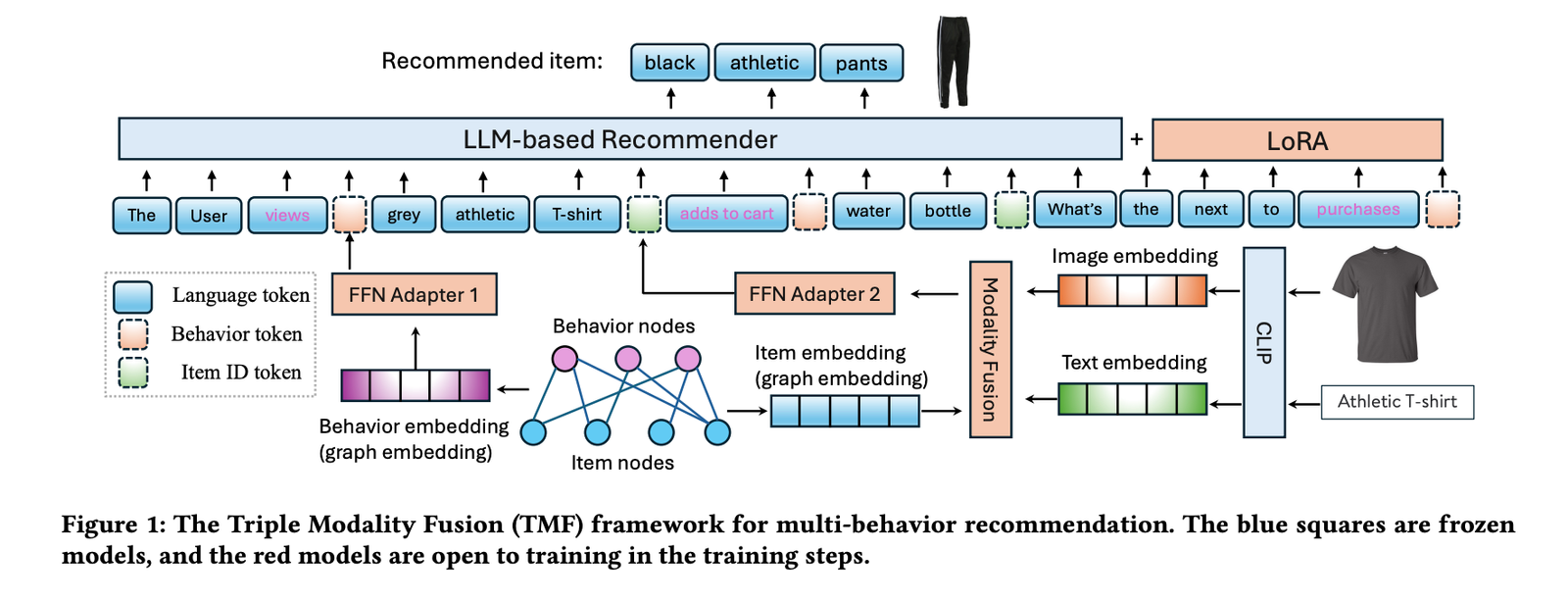 Researchers from Walmart have proposed a novel framework called Triple Modality Fusion (TMF) for multi-behavior recommendations. This method utilizes the fusion of visual, textual, and graph data modalities through alignment with LLMs. Visual data captures contextual and aesthetic item characteristics, textual data provides detailed user interests and item features, and graph data shows relationships in heterogeneous item-behavior graphs. Moreover, researchers developed the modality fusion module based on cross-attention and self-attention mechanisms to integrate different modalities from other models into the same embedding space and incorporate them into an LLM.
