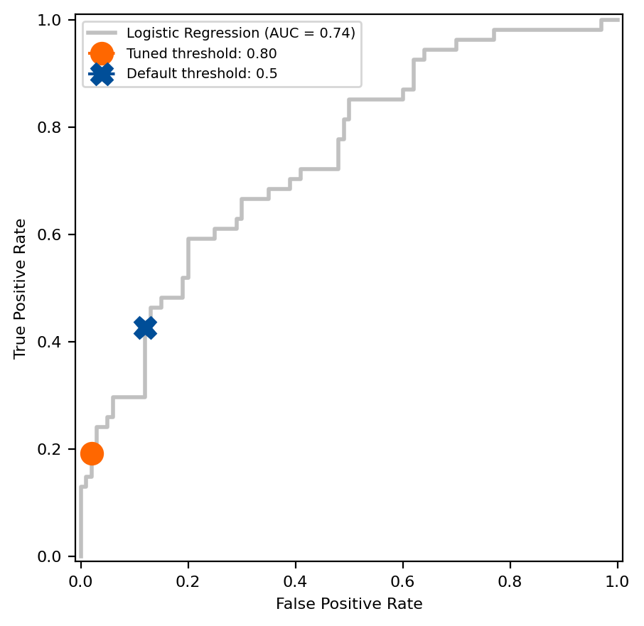 # Plot the ROC curve and compare the default threshold to the tuned threshold