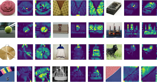 In order to understand how ViT processes image data, it is important to analyze its internal representations. In Part 3, we saw that the input patches generated from the image are fed into a linear embedding layer that projects the 16×16 patch into a lower dimensional vector space, and its resulting embedded representations are then appended with positional embeddings. Fig. 9 shows that the model indeed learns to encode the relative position of each patch in the image. The authors used cosine similarity between the learned positional embeddings across patches [3]. High cosine similarity values emerge on similar relative area within the position embedding matrix corresponding to the patch; i.e., the top right patch (row 1, col 7) has a corresponding high cosine similarity value (yellow pixels) on the top-right area of the position embedding matrix [3].