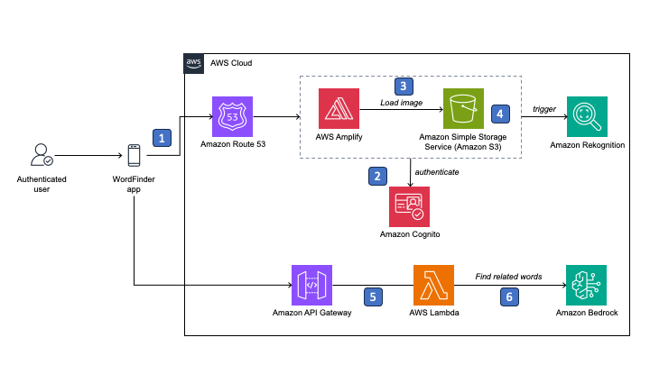 - The journey begins with the user accessing the WordFinder app through a domain managed by Amazon Route 53, a highly available and scalable cloud DNS web service. AWS Amplify hosts the React Native frontend, providing a seamless cross-environment experience.